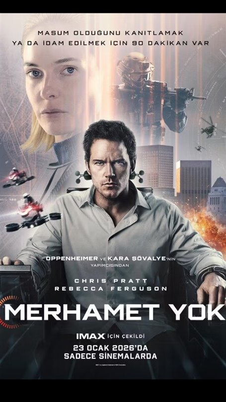 Chris Pratt ve Rebecca Ferguson’ın başrollerini paylaştığı, Timur Bekmambetov’un yönettiği ‘Merhamet Yok’ (Mercy), yakın gelecekte geçen yüksek tempolu bir bilim kurgu–gerilim hikâyesi sunuyor. LAPD cinayet masası dedektifi Chris Raven, eşinin cinayetiyle suçlanarak ‘Mercy’ adı verilen, her şeyi veriyle yargılayan devrim niteliğinde bir adalet sisteminin karşısına çıkarılır. Raven’ın masumiyetini kanıtlamak için yalnızca 90 dakikası vardır.