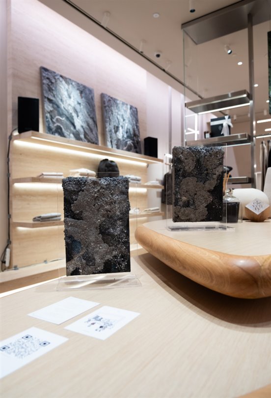 Tuz kristallerinin ışıkla etkileşimi, Eleventy’nin estetik anlayışıyla birleşerek izleyiciye dingin ama derinlikli bir görsel deneyim sunuyor. Eleventy Sonbahar–Kış 2025 Koleksiyonu’ndan ilhamla hazırlanan eserler, koleksiyonun doğal renk paletiyle bütünleşiyor. Eserlerde, Eleventy’nin karakteristik griye çalan soğuk mavi tonları korunurken; canlı bir etki yaratan ultramarin mavisiyle palet zenginleşiyor. Bu tonlar, tuz kristallerinin dokusuyla buluşarak doğanın sessiz gücünü ve Eleventy’nin rafine estetiğini yansıtan bütünsel bir anlatı oluşturuyor. Gri ve mavi tonlarının zarif dengesi, denizlerin çekilişinden geriye kalan yeryüzü izlerini ve insanın kendi içsel denizine uzanan metaforik bir yolculuğu çağrıştırıyor.