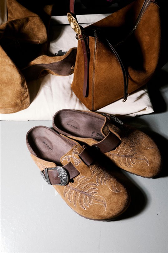 Birinci sınıf süet ve yumuşak nappa deriden yeniden tasarlanan ‘Boston’, işlemeli detaylar ve Vahşi Batı esintili tokalarla zenginleştirilmiş. Dış taban ise Birkenstock'un ünlü kemik desenli tabanını Etro'nun Paisley amblemiyle birleştirerek, ayak altında zarif ama belirgin bir imza sunuyor.
