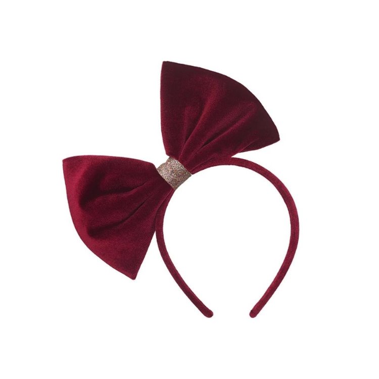 Zengin bordo kadife kumaş ve oversize fiyonk detayıyla bu taç, sezonun en gösterişli aksesuarlarından. Sade elbiseleri bile tek dokunuşla yılbaşı şıklığına taşıyor.