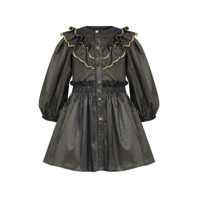 Moondale’s Kids Santa Siyah Elbise; gold çizgileri, fırfırlı yakası ve balon kol detaylarıyla hem şık hem eğlenceli. %100 pamuk kumaşı sayesinde konforlu, tasarımıyla ise göz alıcı.