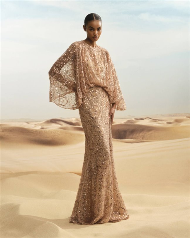 Fildişi ve keçiboynuzu rengi monogramlı takımlar, sade bir gündüz şıklığı sunuyor. İnce eşarplar ve pelerin kolları çöl esintileri gibi hareket ederken, tüylü manşetler sade siluetlere hareket katıyor. Bu parçalar, tek bir kıyafetin sabah buluşmalarından akşam kutlamalarına zahmetsizce uyum sağladığı, dönüşümlü haute couture'e yönelik artan lüks trendini yansıtıyor.