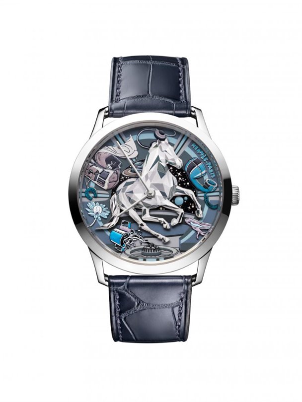 Mavi ve sarının zengin kontrastlarıyla vurgulanan bu kozmik sahnenin merkezinde, heykeltraş gümüş bir at yer alıyor. İnce fasetlenmiş formu, merkezi kadrana uygulanmadan önce aşındırma içeren bir boyama işlemiyle elde ediliyor. Atın göğsünde, saat ve dakikaları gösteren iki baton tarzı kol bulunuyor.