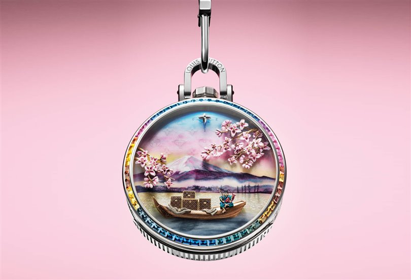 Saat 12 yönünde yer alan altın rengi pusula gülü, zarifçe narin Louis Vuitton Monogram çiçekleriyle süslenmiş pembe-mavi bir gökyüzüne karşı dönüyor.