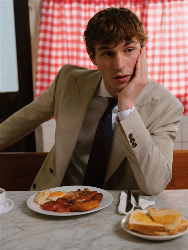 Yün ve ketenin özenle harmanlanmış kumaşı, farklı mevsimlerde kullanılabilme özelliği, yapı ve dokuma hafiflik ve nefes alabilirlik sağlaması nedeniyle seçildi. Daha keskin ama yumuşak omuzlu silüeti, duruş ve rahatlık arasında bir denge kurarken, klasik Glen ekose deseni, aşırıya kaçmadan doku ve derinlik katıyor; yakından görülebilen ancak genel tasarıma kusursuz bir şekilde uyan bir desen sunuyor.