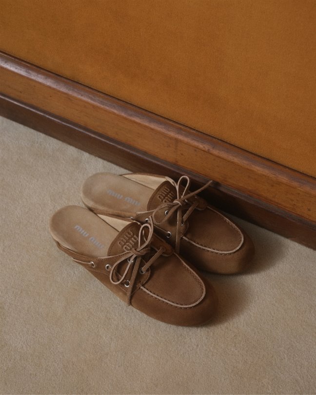 Çok sevilen Miu Miu tekne ayakkabıları, püskül ya da deri bağcık gibi ayırt edici detaylarıyla marka için bir klasik hâline geliyor. Tasarım, ultra düz ve son derece hafif bir yorumla; topuk siluetini görünür kılacak şekilde arka kısmı açılarak tasarlanmış yeni bir slip-on modelle birlikte sunuluyor.