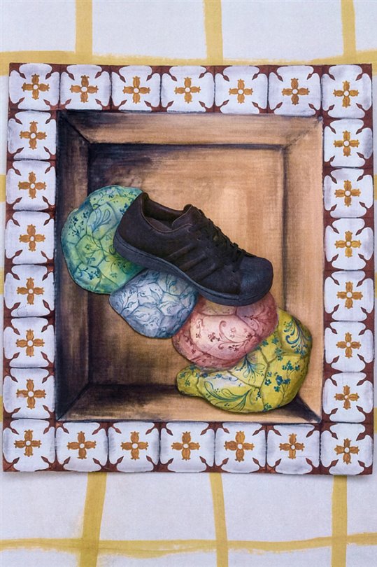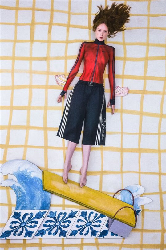 Koleksiyonda ayakkabılar ön planda olsa da, kıyafetler de aynı orantı ve çelişki duygusunu koruyor. Trompe-l'œil tarzı spor üstler boyalı kumaşları taklit ediyor, şişme montlar çizgi film boyutlarında balon gibi şişiyor ve aksesuarlar ayakkabıların abartılı geometrisinin heykelsi uzantıları olarak karşımıza çıkıyor.