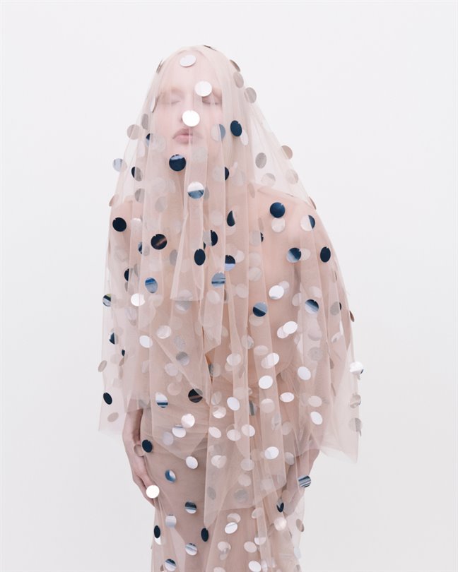 Koleksiyondaki bir diğer tema ise hareket… Yumuşak deri etekler bacakları ortaya çıkaracak şekilde drapelenmiş, asimetrik elbiseler vücudu sarıp kıvrılıyor ve küçük yansıtıcı diskler sallanırken ışığı yakalıyor. Kalçada kumaşın esnekliğiyle dikkat çeken büzgülü mini elbise, Koma'nın yapıyı yumuşaklıkla birleştirme yeteneğini gösteriyor.