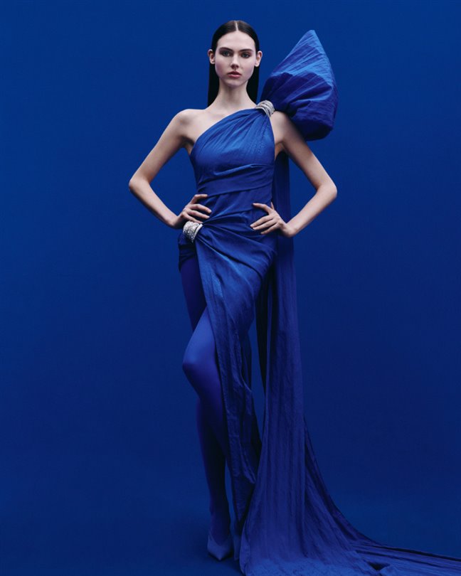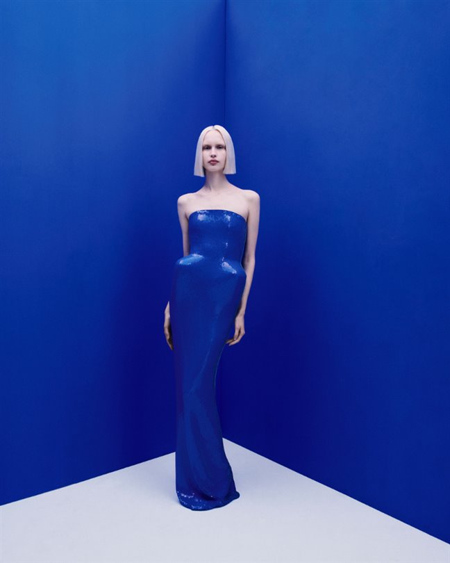 David Koma, kış 2025 koleksiyonunda sade ve heykelsi şekillere odaklanıyor. Kadife kumaştan üretilen elbiseler vücuda yumuşak bir şekilde otururken, uzun siyah elbiseler sütun gibi düz bir şekilde aşağı doğru iniyor ve keskin, modern kesimlerle açılıyor. Büyük fiyonklar tafta tasarımlara dramatik bir hava katarken, kavisli detaylar parlak mavi parçalarda yeni şekiller yaratıyor.