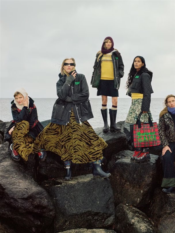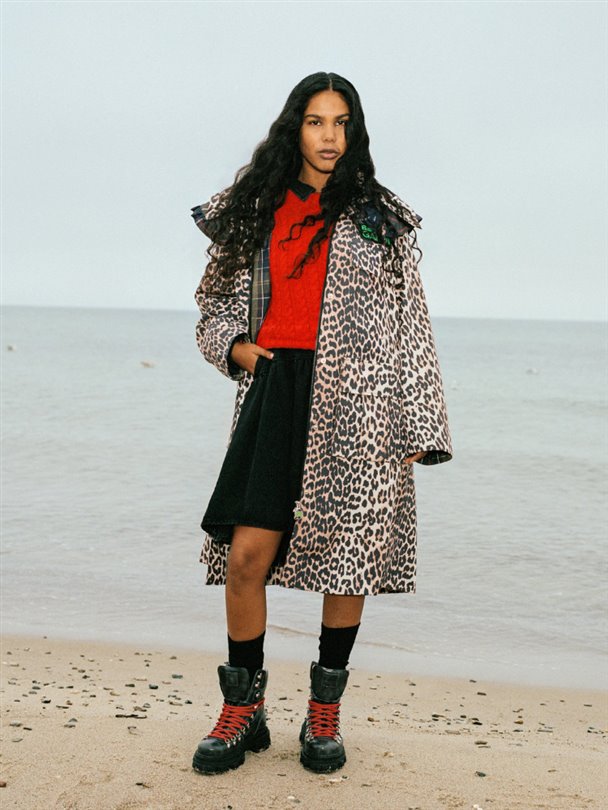 Barbour'un klasik ekose desenine, Ganni'yi yansıtan leopar deseni eşlik ediyor; toprak tonları tüm parçalara nüfuz ediyor ve kırmızı, koleksiyon boyunca vurgu rengi olarak öne çıkıyor.
