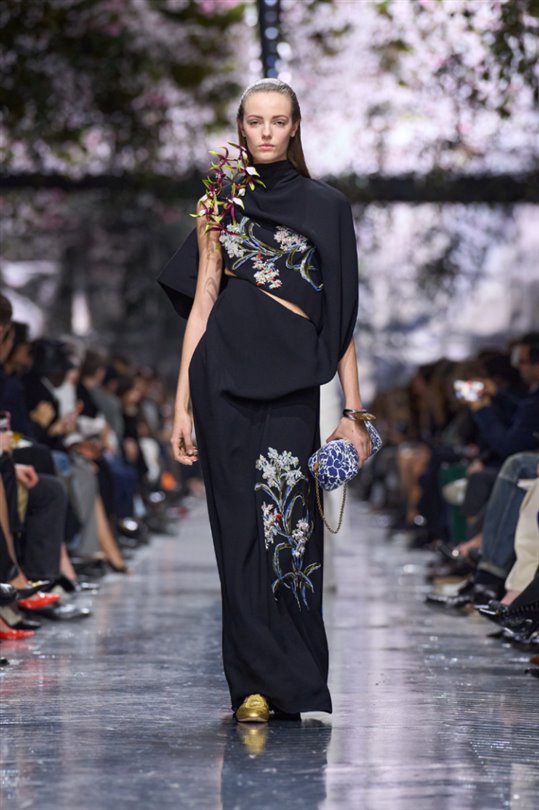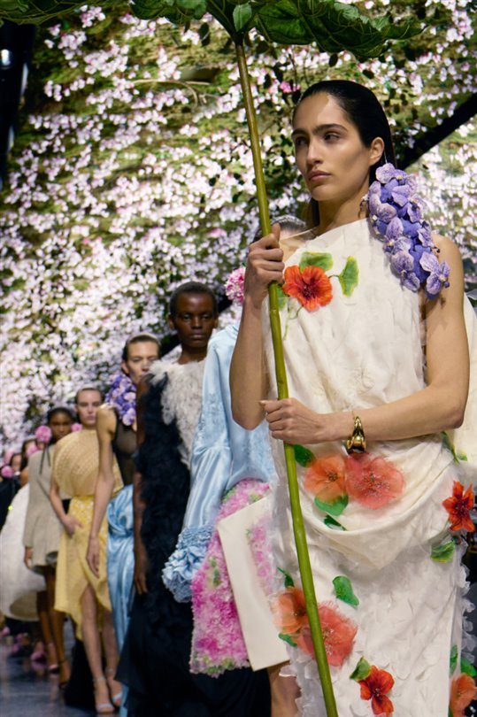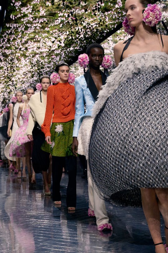 Koleksiyondaki yarı saydam, kıvrımlı üst kısımlar deniz kabukları kadar hassastı, tüylü pullar ise kelebek kanatlarının aşırı makro yakın çekimlerini andırıyordu. Vücudu yumuşak kıvrımlarla saran örgü mini pelerinler, Dior'un ‘çiçek kadınları’na yeni bir yorum getirirken, markanın kurucusu Christian Dior’un en sevdiği çiçek olan müge çiçeğinin büyütülmüş versiyonlarını andıran çan şeklindeki elbiseler de aynı etkiyi yaratıyordu.