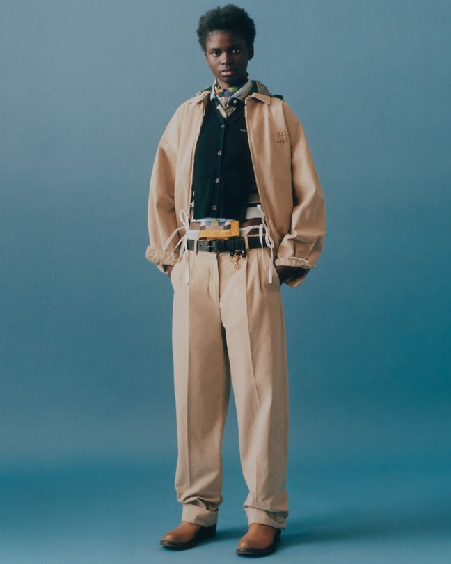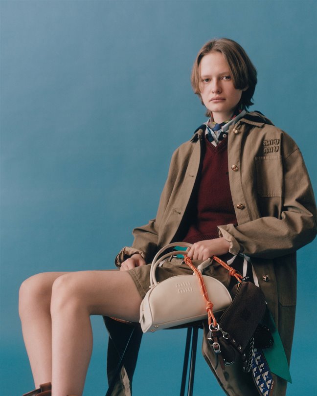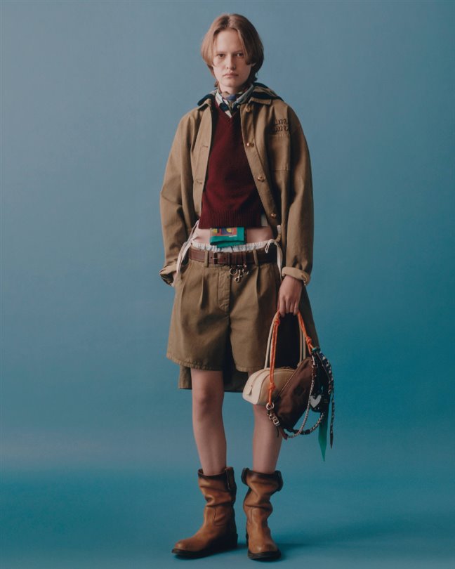Koleksiyonda; Miu Miu’nun ikonik parçaları yeni başlangıçlar için yeniden yorumlanıyor. Logolu pamuk kanvas, fermuarlı ceketler; şortlar, pantolonlar ve balon formdaki mikro mini etekler haki ve pudra tonlarında, düşük bel kesimlerle kullanılıyor. Açık tonlardaki önlük elbiseler ve haki seçenekler; çizgili rugby ve polo tişörtlerin üzerine ya da koyu asker yeşili mumlu ceketlerin altına katmanlanıyor. Üniforma tonları ve kırmızı renkte tasarlanan küçültülmüş trikolar ile pamuk poplin gömlekler ise sıcaklık hissi sunarken, oranlarla oynayan zekice bir tasarım anlayışını yansıtıyor.