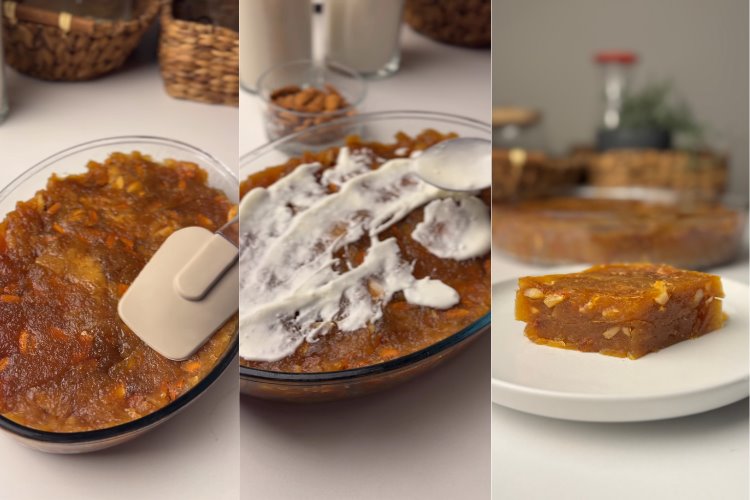 İçine yağ ve bademleri ilave edip katılaşana kadar karıştırıyoruz. Rengi dönünce borcama ya da tepsiye alıyoruz.