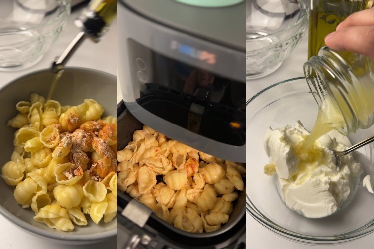 Haşladığımız makarnalara baharatlar ve yağı karıştırıp airfryer’a gönderiyoruz. (180 derecede 15 dk yeterli olacaktır. Ara ara karıştıralım)