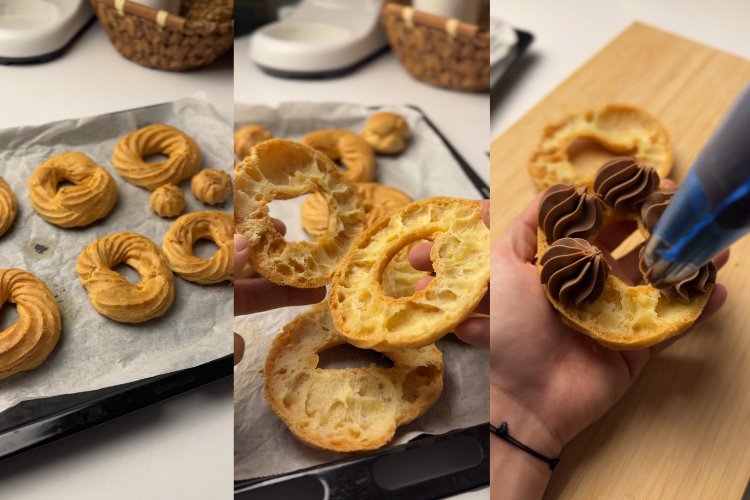 İlk sıcağını atınca yumurtaları tek tek ekleyerek krema kıvamında bir hamur elde ediyoruz.