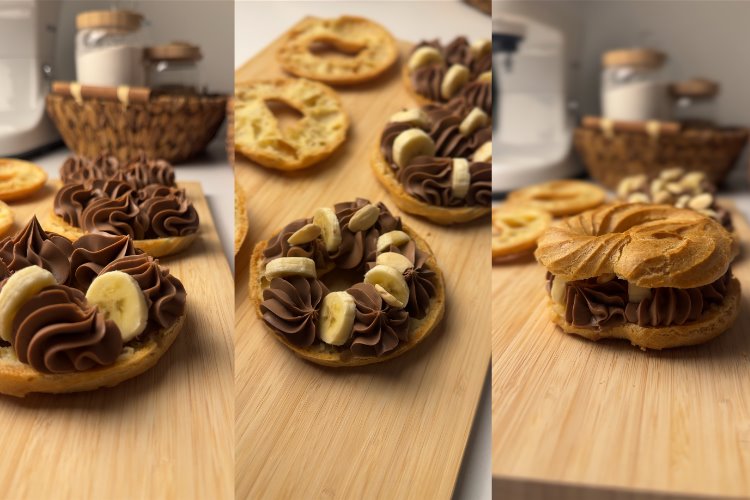 Bir yarısının üzerine çikolatalı krema, muz ve badem koyduktan sonra diğer yarısını üstüne koyuyoruz.