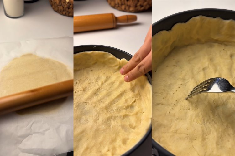 Hamuru düz hale getirip tart kalıbımıza dikkatlice seriyoruz. Tabana çatalla delikler açıyoruz. Etimizi hazırlarken hamuru dondurucuya atıyoruz.