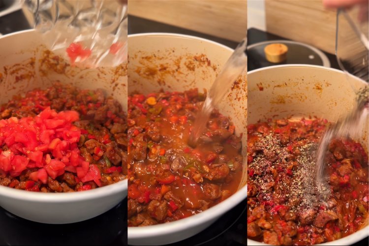 Et için; soğan ve eti yağda pişirmeye başlıyoruz. Et suyunu bırakmaya başlayınca orta ateşte kapağını kapatıp suyunu tekrar çektiriyoruz. Etler yumuşayınca da küpler halinde doğradığımız biberi, domatesi, salçayı, baharatları ve suyunu ilave ediyoruz. Bu şekilde diğer malzemeler de pişince tamamdır.