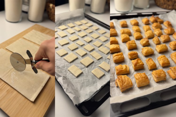 Milföyleri küçük kareler halinde kesip 180 derece alt üst ısınmış fırında kızarıp kabarana kadar pişiriyoruz.