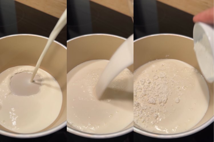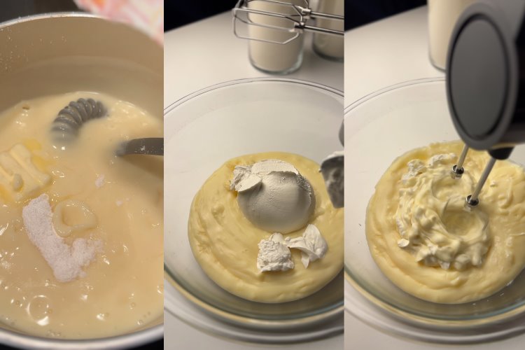 Krema için süt, şeker, nişasta ve yumurtayı iyice karıştırıp orta ateşte pişiriyoruz. Göz göz olunca ocaktan alıp vanilya ve tereyağını ekliyoruz.