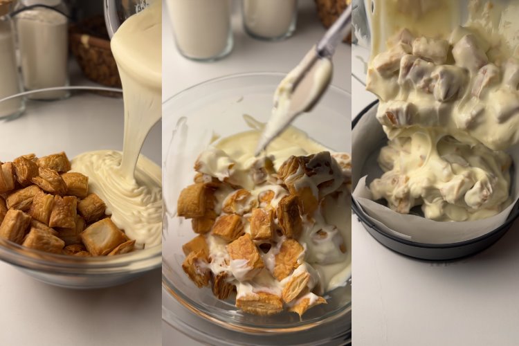 Soğumuş milföyler ile kremayı dikkatlice karıştırıyoruz. Kalıba ya da Borcam’a aktarıyoruz.