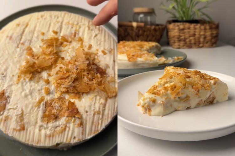 Üzerindeki kırıntılar için bir adet milföy hamurunu aynı şekilde pişirip elimizle parçalıyoruz.