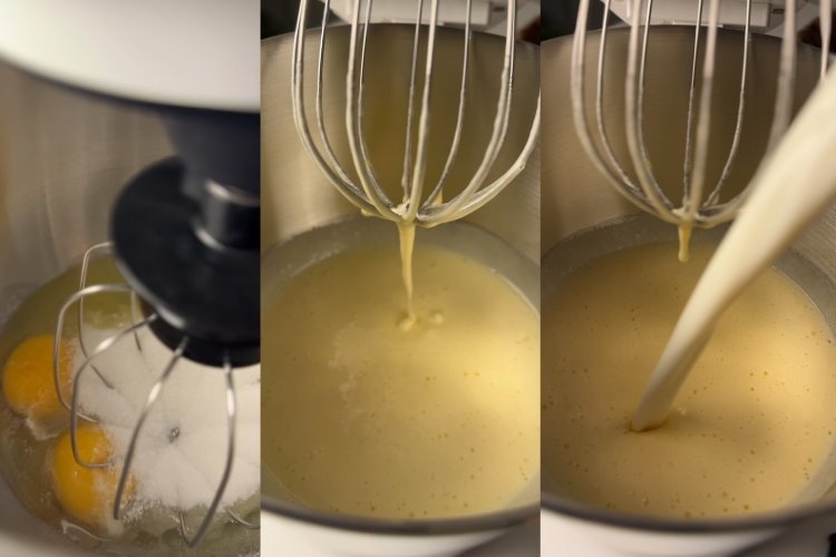 Revani için; yumurta ve şekeri beyaz köpük olana kadar çırpıyoruz. Süt ve yağı ilave edip biraz karıştırıyoruz.