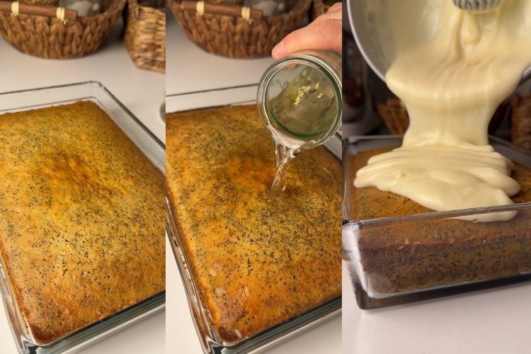 Revani ilk sıcağını atınca soğuyan şerbetimizi döküyoruz.