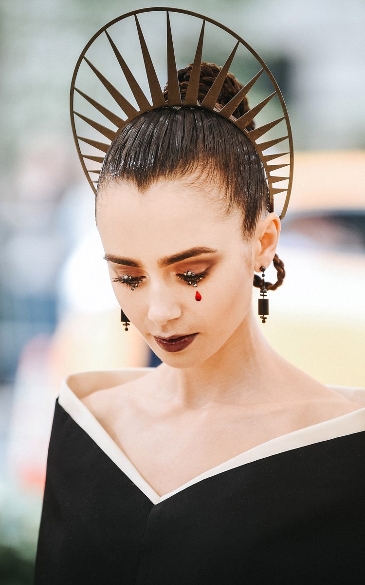 Genç oyuncunun saç stilisti Özgürlük Heykeli’nden ilham alarak siyah bir taç kullandı. Collins’in gotik görünümüne arkada sımsıkı örülen saçları eşlik ediyor. Bu kalın ve ucunda üçe ayrılan örgü bir hayli dikkat çekici.
