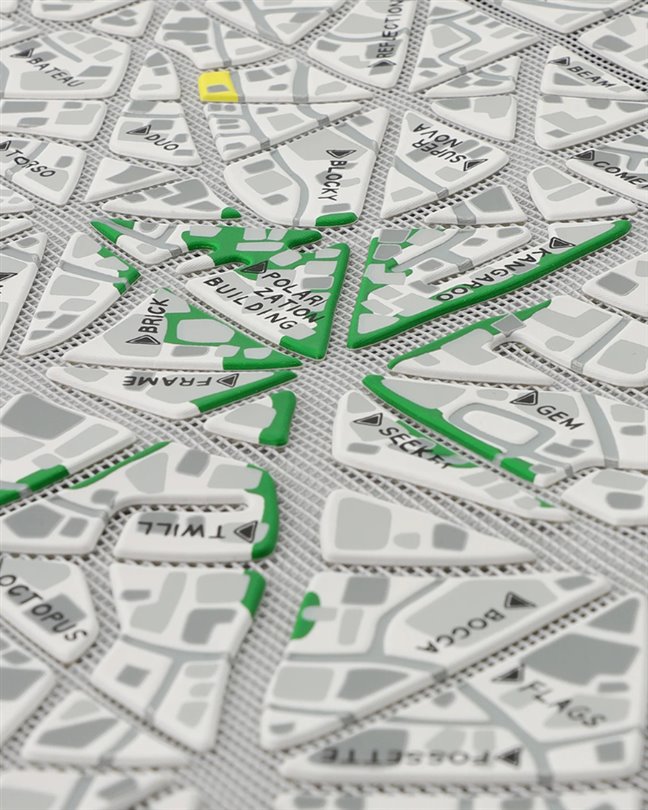 Üçgenlerin üzerinde geçmiş Bao Bao tasarımlarının isimleri yer alıyor ve bu, hayali metropolün simge yapılarını ve sokaklarını temsil eden bir anlatı katmanı ekliyor.