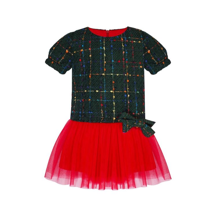 Bleu Lapin Scarlett Elbise, tüvit kumaşın zarafetini kırmızı tütü detaylarıyla buluşturuyor. Yılbaşı gecesinde miniklerin parlamasını sağlayan iddialı ama zarif bir tasarım.