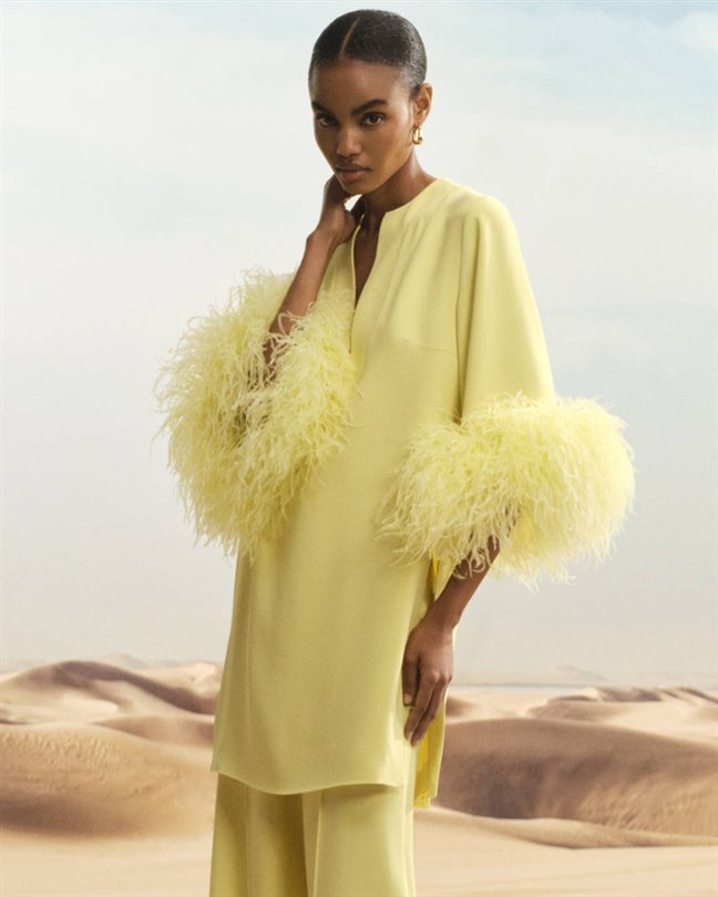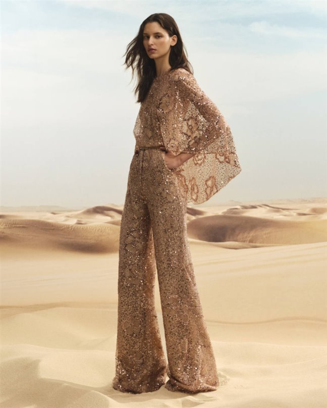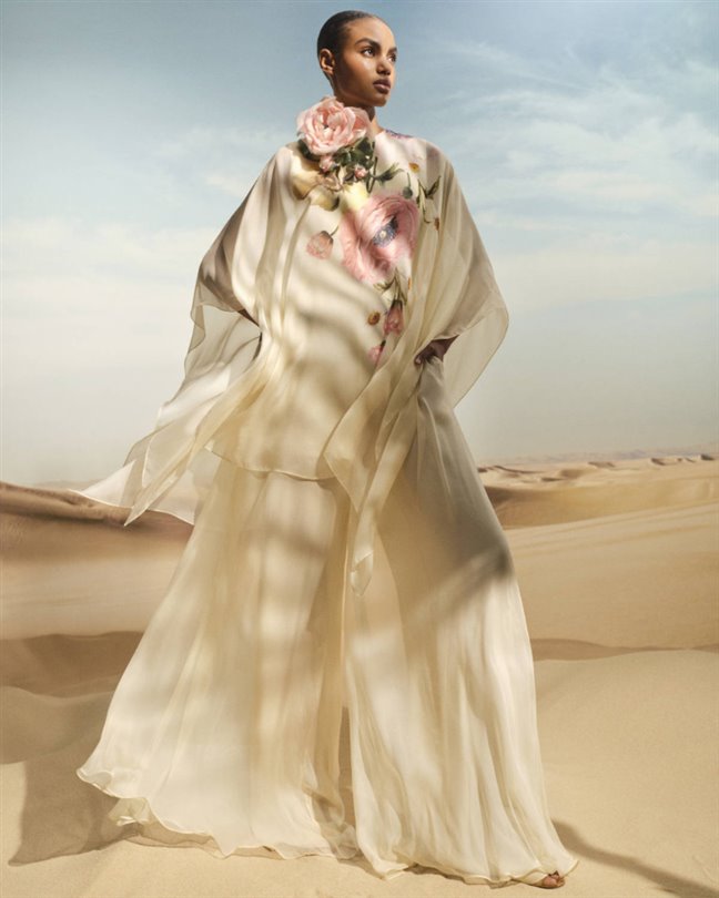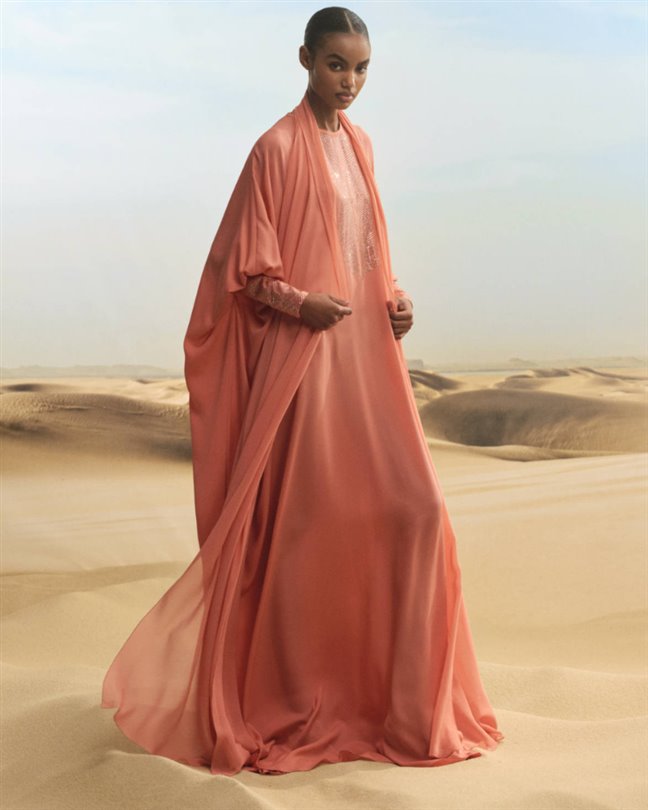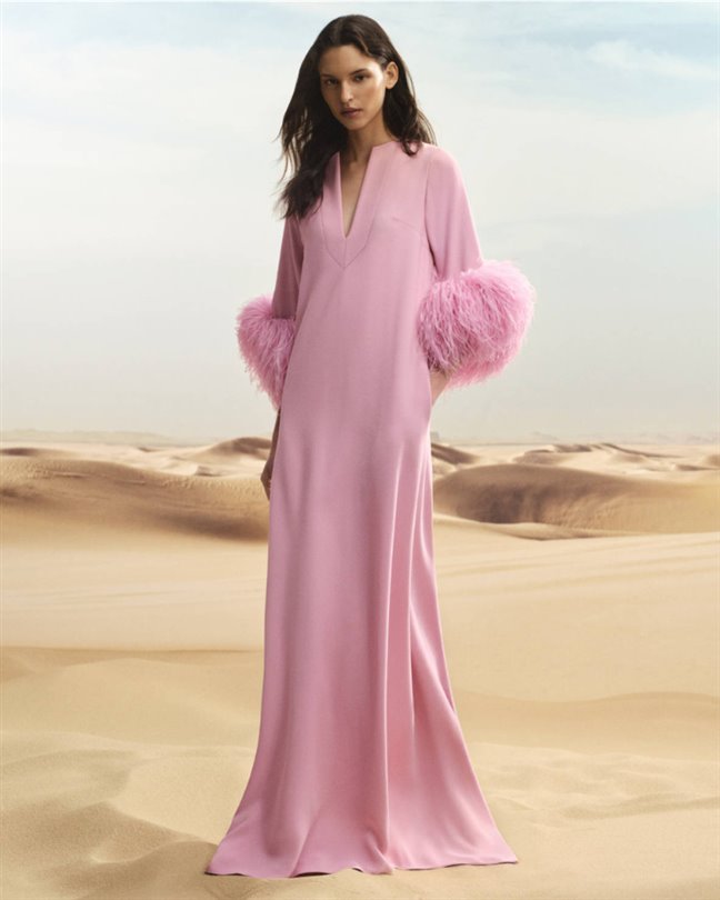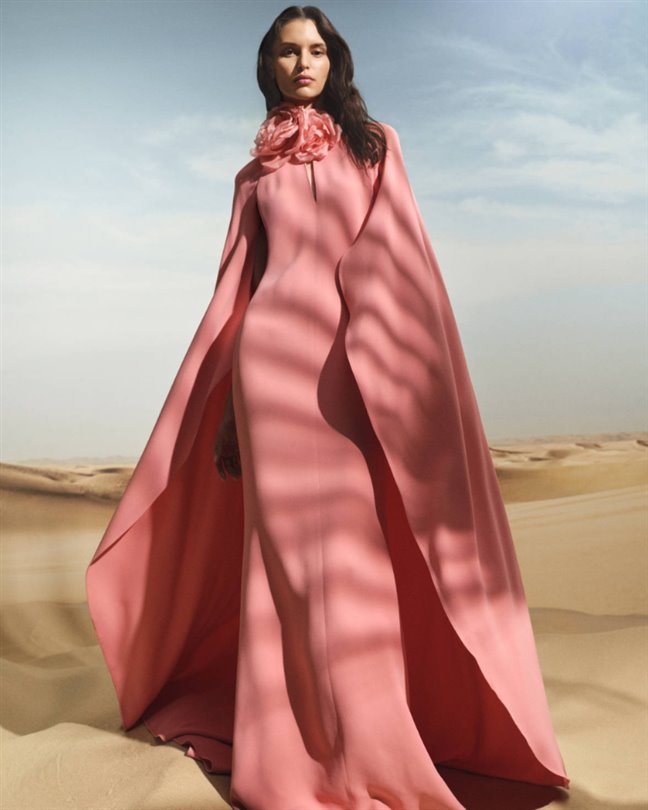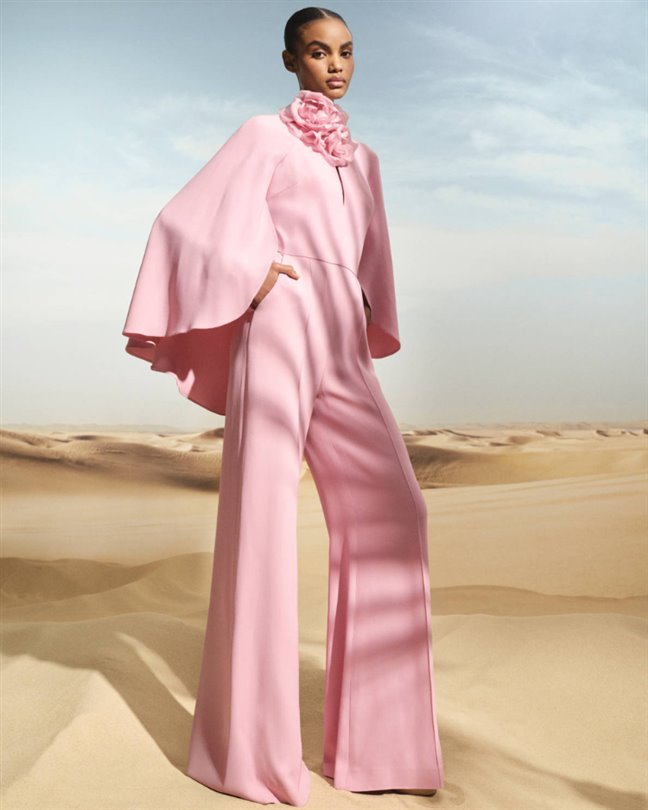 Çölün sembolik çiçeği, kapsül koleksiyonunun her yerinde kendini gösteriyor. Akıcı krem rengi bir kaftan, üç boyutlu şifon bir çiçeği sergilerken; pembe-bronz bir maksi elbise, gün batımı buluşmalarının ışıltısını yakalamak için şeffaf kumaş üzerine işlemeler katmanlıyor. Heykelsi pembe bir tulum ise çiçeği yaka kısmına yerleştirerek kadınsılığı mimari güçle dengeliyor.