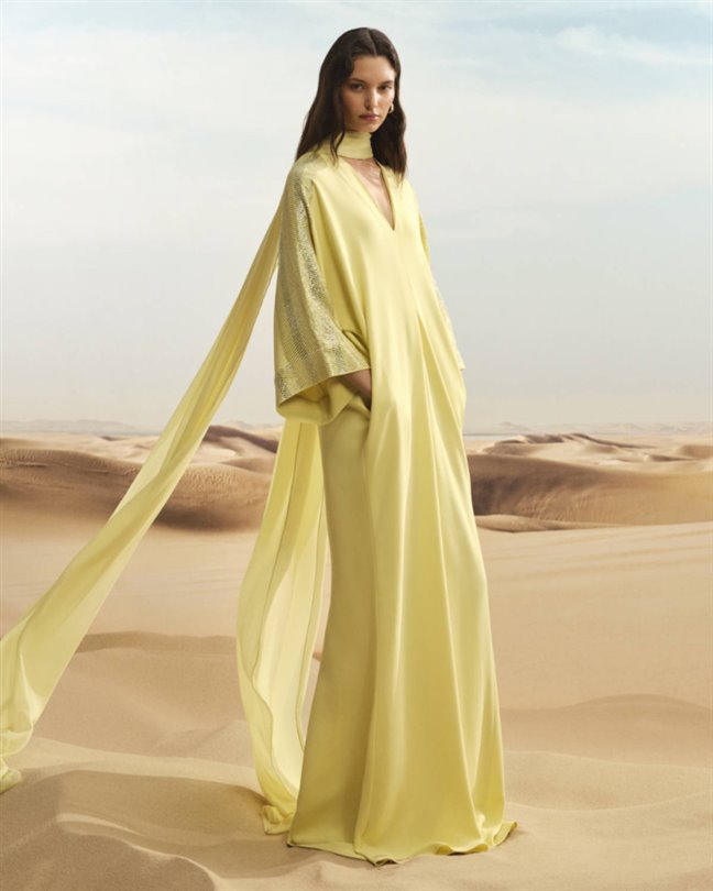 Fildişi ve keçiboynuzu rengi monogramlı takımlar, sade bir gündüz şıklığı sunuyor. İnce eşarplar ve pelerin kolları çöl esintileri gibi hareket ederken, tüylü manşetler sade siluetlere hareket katıyor. Bu parçalar, tek bir kıyafetin sabah buluşmalarından akşam kutlamalarına zahmetsizce uyum sağladığı, dönüşümlü haute couture'e yönelik artan lüks trendini yansıtıyor.