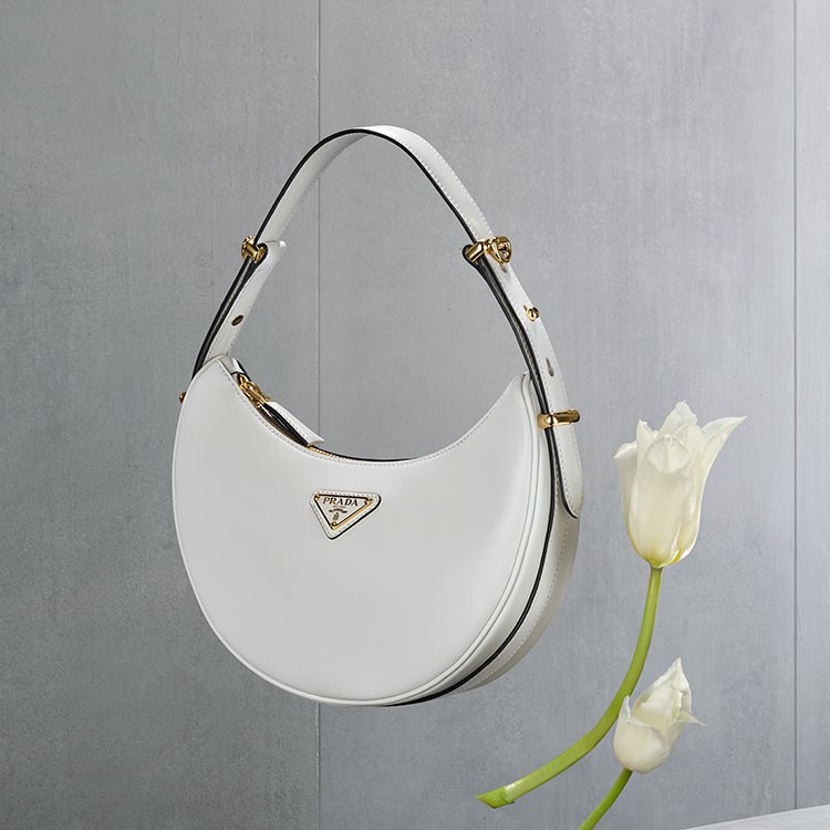 Göz alıcı modern tasarımıyla yeni Prada Arqué çanta, Prada estetiğine ait temel unsurların taze ve orijinal bir yorumunu sunuyor. Çantanın ayırt edici hilal şekli, sofistike ayrıntılar ve işçilikle zenginleştirilmiş. Omuz askısı, çantanın geometrik hassasiyetini ve dengesini vurguluyor. Modele ilham veren zamansız Hobo çanta tasarımı, yumuşak dana derisi gövde ve Nappa deri astar gibi değerli unsurlarla bir araya geliyor.