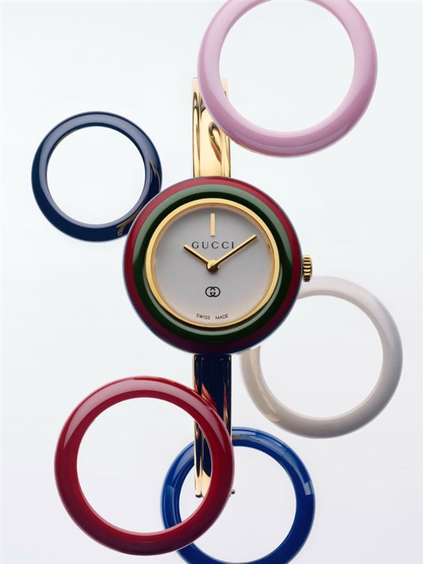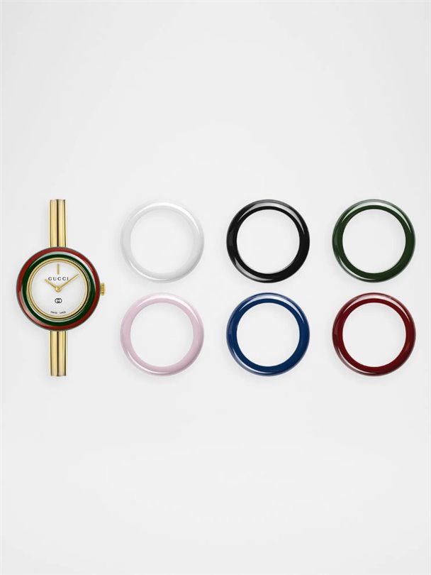Gucci ‘Play’ saat koleksiyonunun en ünlü ve dikkat çekici özelliği, şüphesiz birden fazla değiştirilebilir renkli çerçeveye sahip olması; yani bir saat alıyorsunuz ve tam yedi farklı renkte saatiniz oluyor!