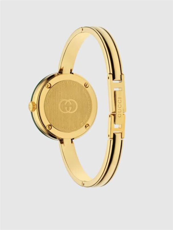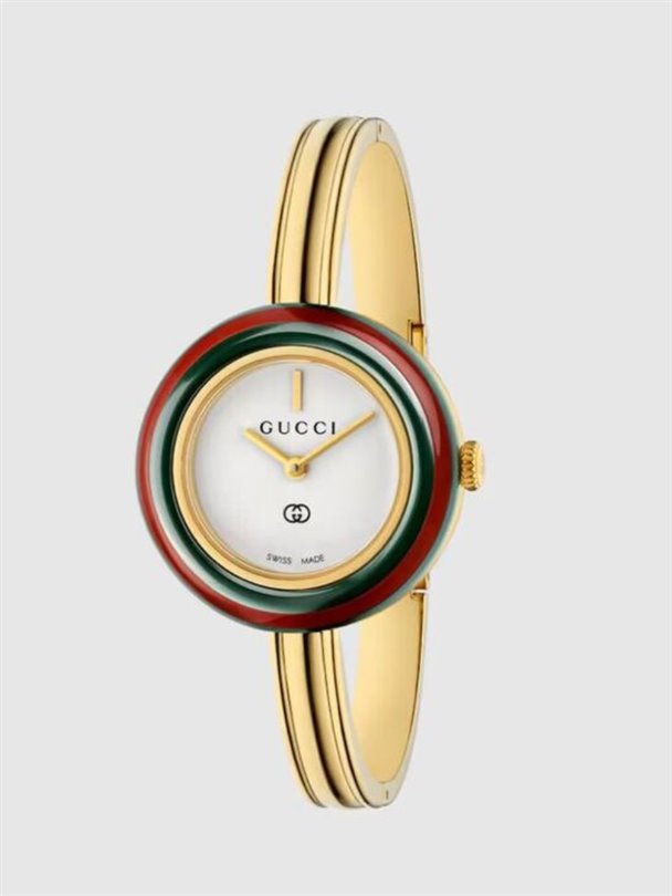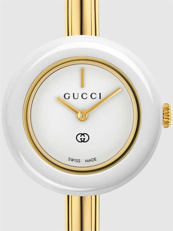 Yeni çıkan Gucci ‘Play’ koleksiyonu; yedi adet değiştirilebilir renkli seramik çerçeve, klasik Gucci logosuyla süslenmiş beyaz bir kadran ve hassas bir kuvars mekanizma içeriyor. Tüm bu unsurlar, bu 28 mm bej altın paslanmaz çelik saati narin bir bilezik kadar hafif ve zarif, sade ama bir o kadar da özgün kılıyor. Tüm set, özel tasarım yuvarlak bir koleksiyon kutusunda sunuluyor.
