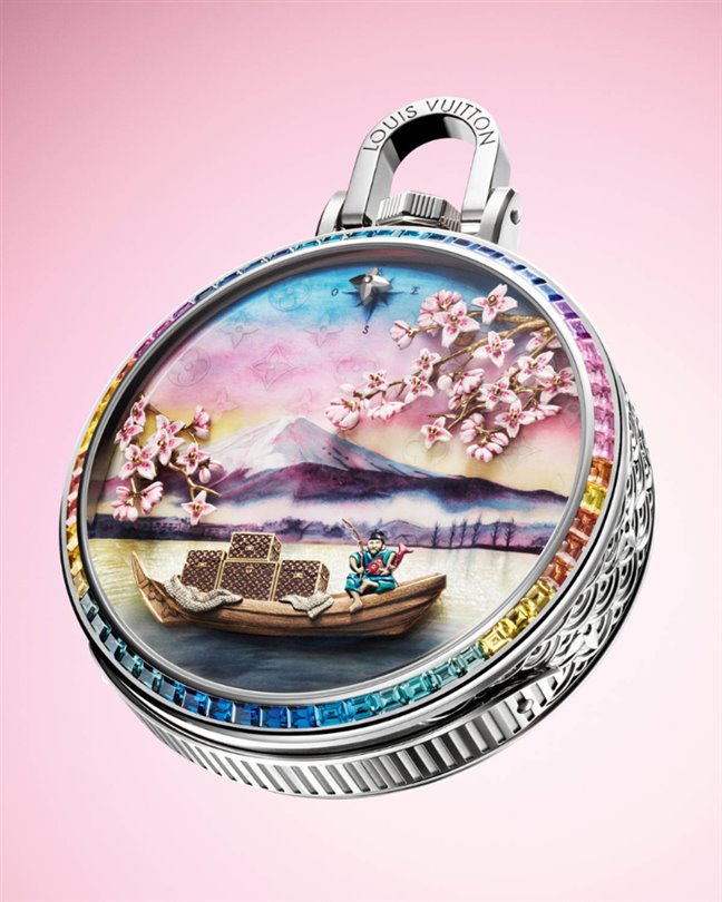 Amazon yağmur ormanları ve Paris'in olağanüstü keşiflerinin ardından, koleksiyonun en yeni harikası, nefes kesen Escale au Mont Fuji cep saatiyle Uzak Doğu'ya yolculuk ediyor.