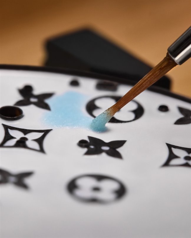 Saat 12 yönünde yer alan altın rengi pusula gülü, zarifçe narin Louis Vuitton Monogram çiçekleriyle süslenmiş pembe-mavi bir gökyüzüne karşı dönüyor.