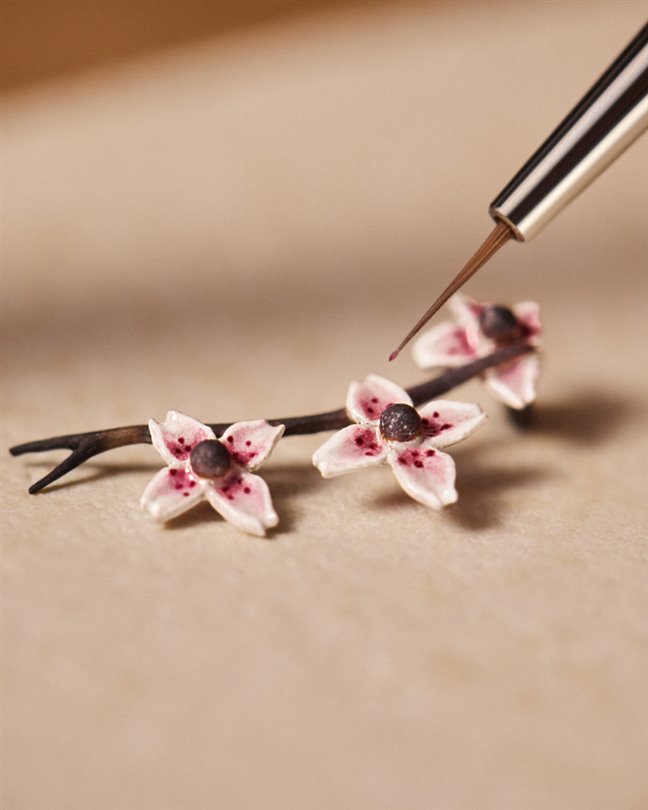 Sarı altın ve mine ile işlenmiş, hafifçe sallanan Sakura kiraz çiçekleri, bu büyüyü tamamlıyor.