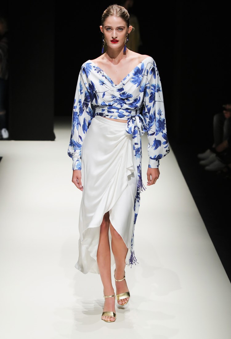 Kobalt mavisinin, kırmızının ve Kodak sarısının hakim olduğu koleksiyonda, tasarımcının imzası haline gelen volanlı ve dik pilise detaylı gece elbiseleri ile etekler söz sahibiyken, akvarel boya efektine sahip çiçek motifleri bol ve boru paça pantolonlara zarif ve ölçülü bir iddia getiriyor. Dekoltede alışık olduğumuz lastik detaylarını drapaj tekniği kullanarak modernize eden Meltem Özbek, İlkbahar / Yaz 2019 koleksiyonunda Akdeniz rivierasını şehre getiriyor.