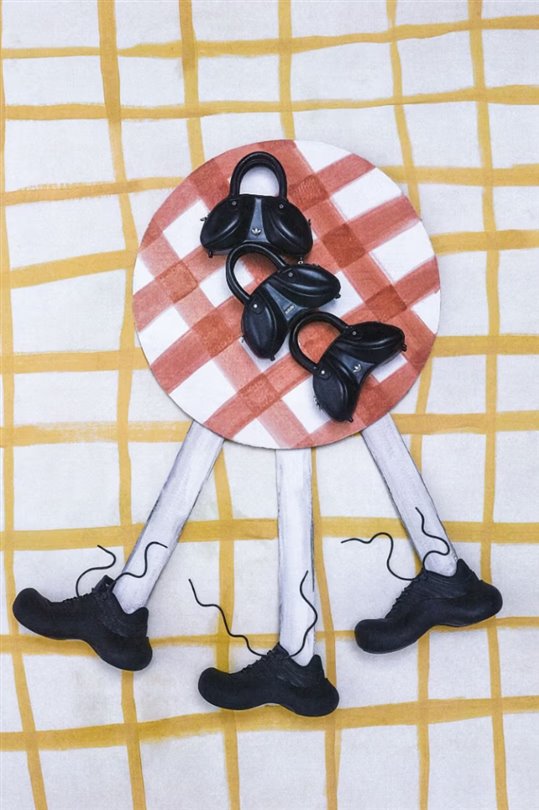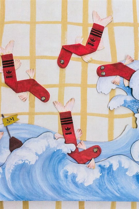 Koleksiyonda ayakkabılar ön planda olsa da, kıyafetler de aynı orantı ve çelişki duygusunu koruyor. Trompe-l'œil tarzı spor üstler boyalı kumaşları taklit ediyor, şişme montlar çizgi film boyutlarında balon gibi şişiyor ve aksesuarlar ayakkabıların abartılı geometrisinin heykelsi uzantıları olarak karşımıza çıkıyor.