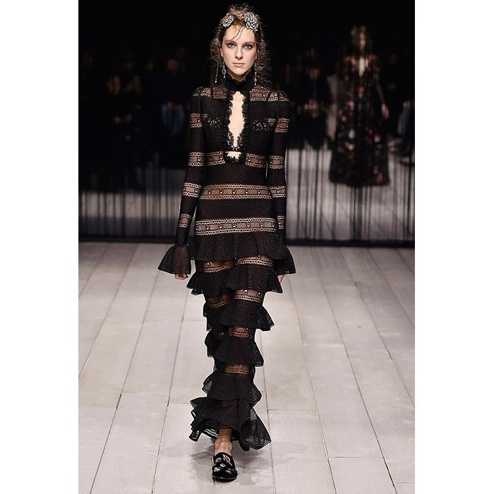 Alexander McQueen’in her sezon olmazsa olmaz parçalarından olan ceket-pantolon takımları salaş kesimlerini içlerindeki dantel büstiyerler ile tamamlanmış. McQueen’in gizemli kadınları onun imzası gibi adeta podyumda. Geri kalanda ise karşınızda transparan kumaşlar ile kelebek ve dudak gibi koleksiyonun simgesi haline gelen figürler ve altın ve gümüşün ihtişamı ile özenle hazırlanmış elbiseler ile büyüleniyorsunuz.