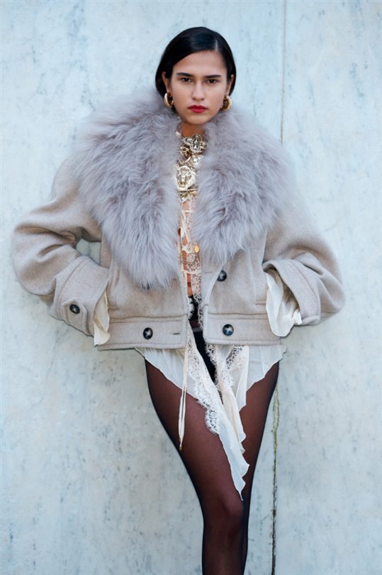Koleksiyon, mini ve maksi georgette elbiselerden kürk yakalı yün ve alpaka paltolara, cesur yüksek kesimli siluetlere sahip karmaşık dantel tulumlara kadar uzanıyor.