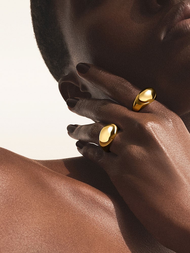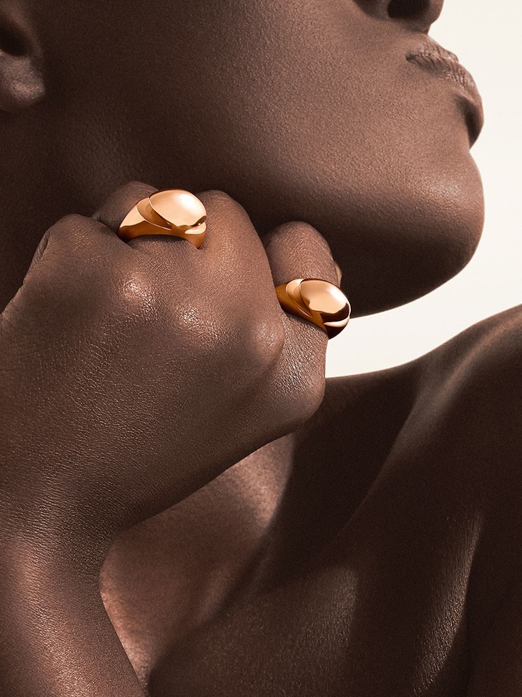 Esneklik ve canlılık, şekil ve hacim arasındaki benzersiz oyunlar, 18 ayar sarı ve pembe altın versiyonlarıyla sunulan yeni Bulgari Cabochon yüzük ve kolyenin ahenkli estetiğinin temelini oluşturuyor.
