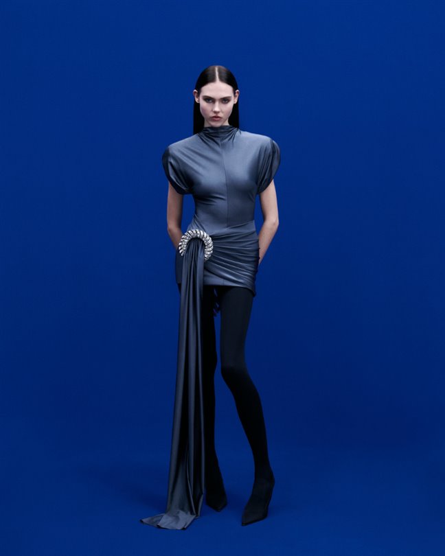 Koleksiyondaki bir diğer tema ise hareket… Yumuşak deri etekler bacakları ortaya çıkaracak şekilde drapelenmiş, asimetrik elbiseler vücudu sarıp kıvrılıyor ve küçük yansıtıcı diskler sallanırken ışığı yakalıyor. Kalçada kumaşın esnekliğiyle dikkat çeken büzgülü mini elbise, Koma'nın yapıyı yumuşaklıkla birleştirme yeteneğini gösteriyor.