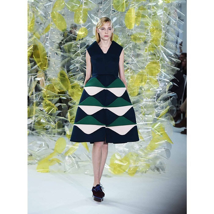 Düz renk parçalar yuvarlak dönüşleri ve tek renk olmaları nedeniyle sade ve minimal gözükseler de abartılı yakalar ve boyun kısımları, etekleri ile etkiyi farklı bir yöne çekiyor. Ayrıca koleksiyonda en çok kullanılan renk olan sarı oldukça yoğun bir tonda… Onun dışında kullanılan mavi, kırmızı, turuncu tonları da yine en can alıcı tonlarından seçilmiş canlı renklerin.