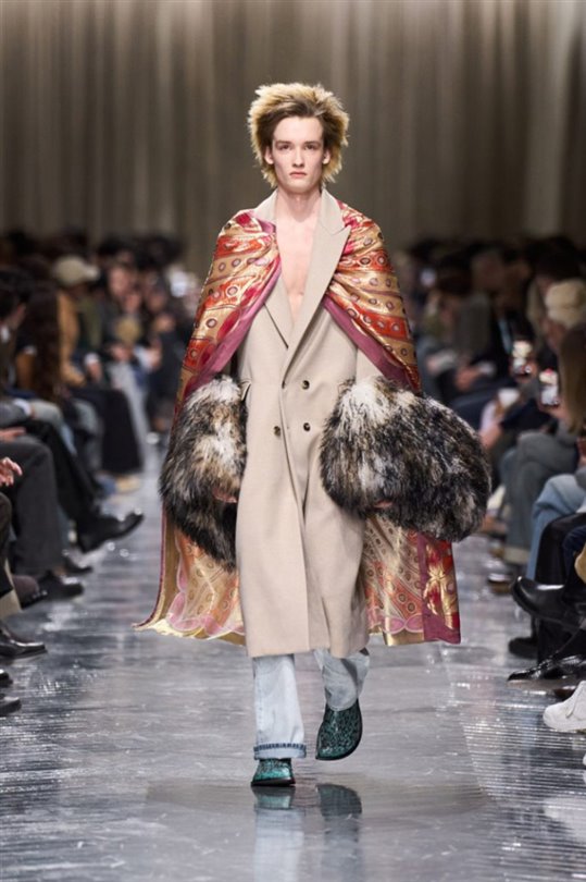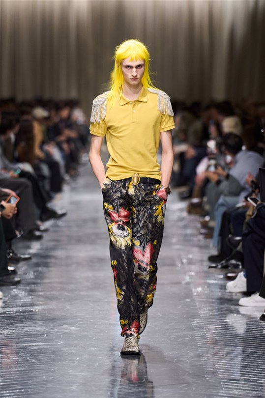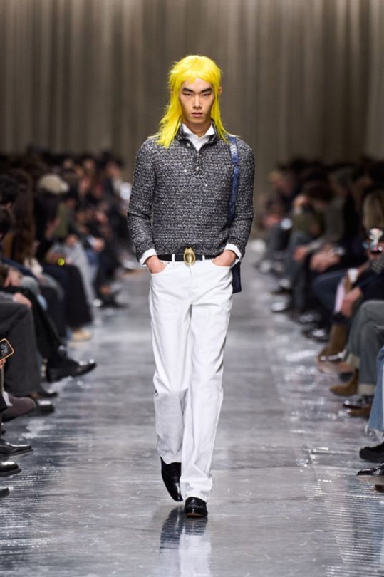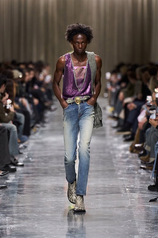 Jonathan Anderson defilede; Belle Époque'un ihtişamını çağrıştıran bir kaosla bir araya getirilmiş, görünüşte birbirinden farklı unsurlardan oluşan bir kolaj sundu. Poiret'nin mor pullu bir flapper elbisesinden ilham alan Anderson, ‘Le Magnifique’in pitoresk ihtişamını çağdaş bir bağlama sentezlemeyi başardı: İlk görünümler, o elbisenin üst kısmını alıp Studio 54 partisine yakışır çarpıcı üstlere dönüştürdü ve dar kot pantolonlar ve Küba topuklu D burunlu botlarla tamamlandı.