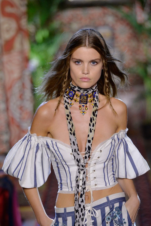 Roberto Cavalli’nin yeni sezon hippi kızları tekrardan karşımızda. Minimalizm, normcore stil bir kenara Cavalli’nin beyni Peter Dundas’ın aklı hep 70’lerde… Mavi ve tabanın birleştiği, İspanyol paçaların ve düşük bellerin, uzun pelerin model ceketlerin öne çıktığı dönem, bu sezon tekrardan Cavalli’nin gündeminde…