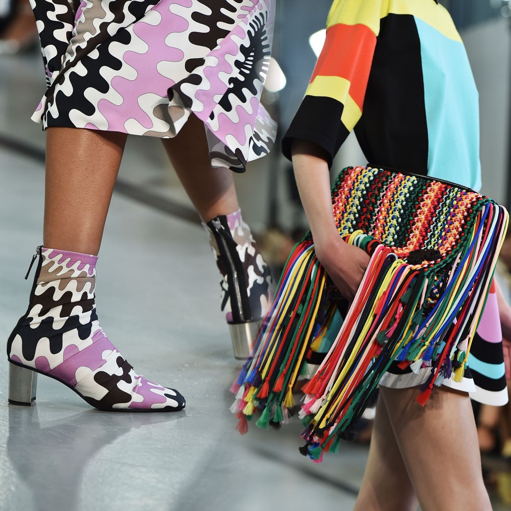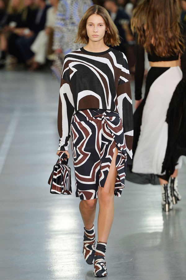 Söz konusu Emilio Pucci olunca akla iki şey geliyor: Renk ve desen. Massimo Giorgetti podyum arkasında “Vintage’ı sevmiyorum, ben geleceği seviyorum” diyor. Bu bakış açısı da çıkardığı işe yansıyor. Kat kat vücudu saran ince sarı bir kumaşın üstüne asimetrik şekilde işlenmiş parıltılı bir pembe detay ancak geleceğe ait olabilir zaten… Pucci’yi ikonik hale getiren desenlerde ise zebra formlar, grafik formlar farklı ve zıt renklerin bir araya gelişiyle yenilikçi bir hava yaratıyor.