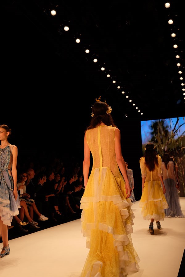 Bora Aksu karşımıza tam bir modern zamanlar masalı çıkarıyor önümüzdeki sezon için… Kat kat etekler, ince kumaşlar, tığ işlemeler ve fırfır detaylar ile elbiseler usta bir işçiliğin eseri olduğunu kanıtlar nitelikte. Sade ve minimal bir tavır sergileyen koleksiyonda renkler ise pastel tonları ile sınırlandırılmış. Uçuk pembeler, bebek mavileri ve açık sarılar ile hazırlanmış koleksiyonda hem renk hem detaylar sizi doğanın kucağına bırakıyor ve kendinizi doğanın prensesleri arasında hissediyorsunuz. Bora Aksu koleksiyonu ve defilesi her bir parçası ve detayı ile tüm moda severleri en etkileyen defilelerin başında geliyor.